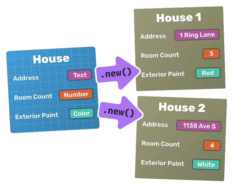 Even though house1 and house2 were created from the same blueprint (class), they have different values for their properties. They’re distinct objects that can exist independently in your game world.