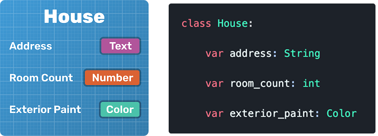 On the left is our “blueprint” for a house and on the right is the same thing as a GDScript class (not a file class though).