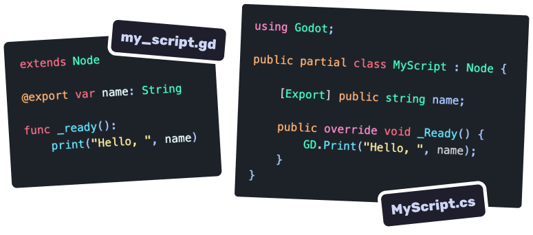 On the left is a GDScript file which itself is a class. On the right is a C# file where we explicitly declare a class using the class keyword.