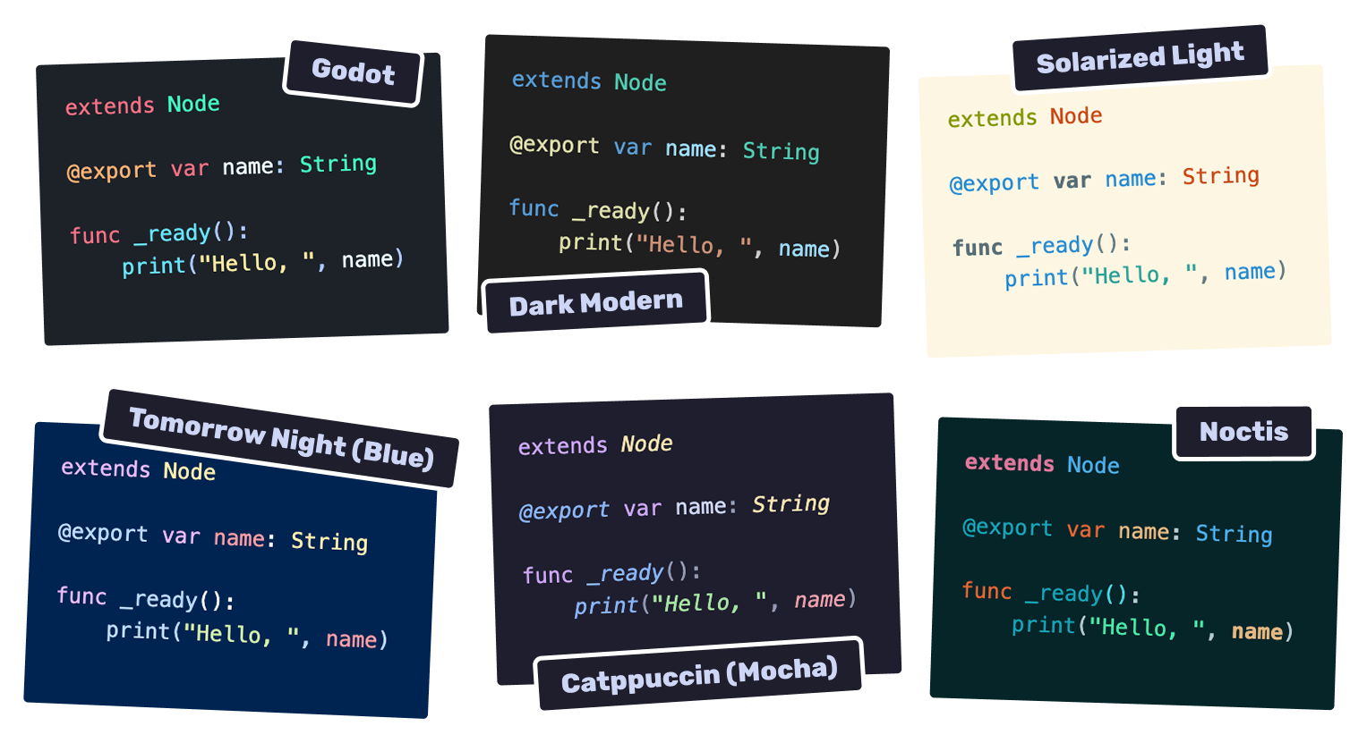 It’s worth noting that the specific colors you see depend entirely on the “theme” of your editor. In Godot, you might be using the default dark theme, but you could switch to another theme and suddenly find that your variables are yellow instead of white. This is why it’s best not to get too attached to specific colors representing specific things.